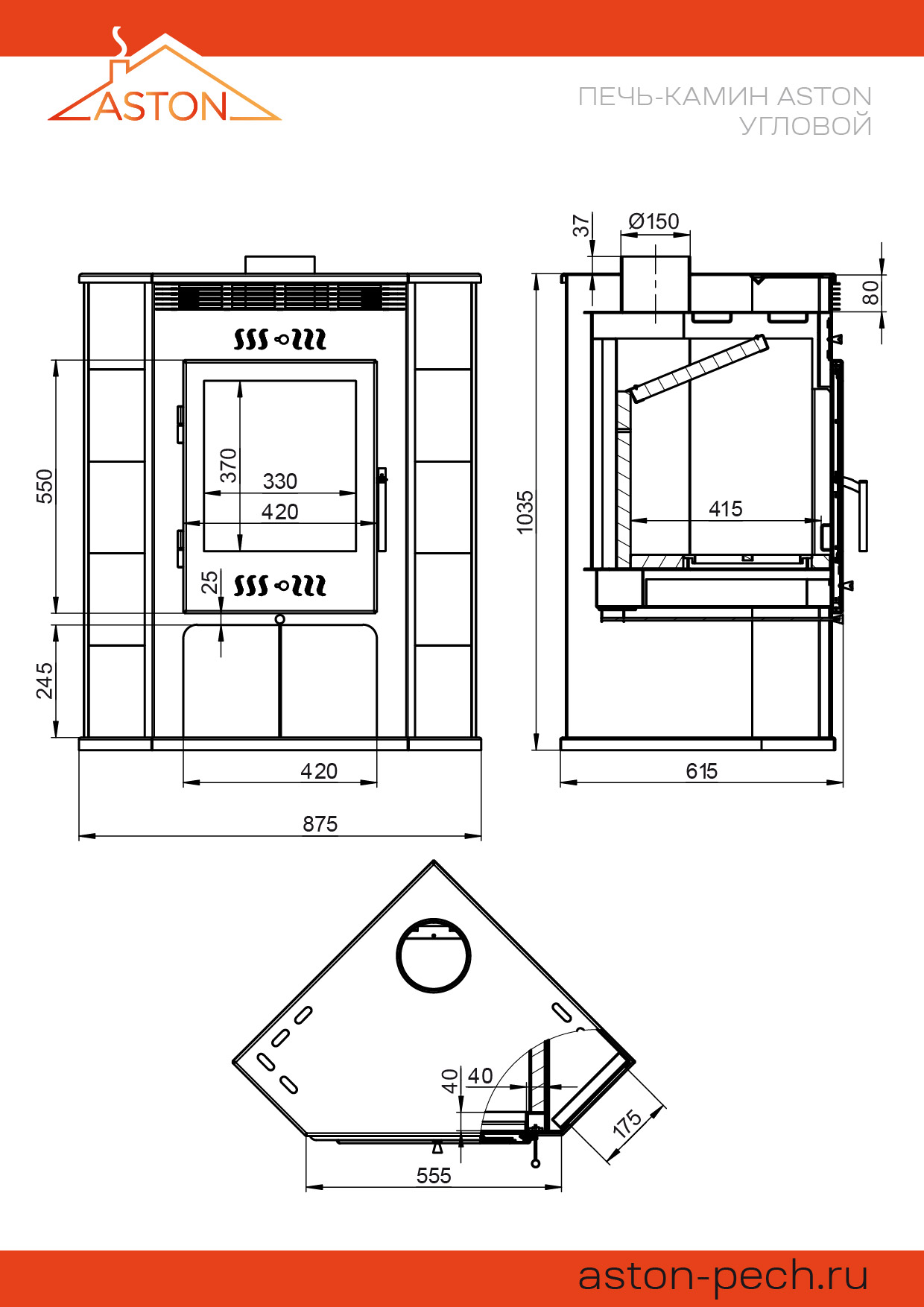 Печь-камин АСТОН 11 кВт угловой изготовлена из особо прочной котловой стали марки 09Г2С. Наиболее термонагруженные участки выполнены из нержавеющей стали марки AISI 430. Печь работает на дровах и рассчитана на угловое размещение. Номинальная мощность печи – 11 кВт. Печь рассчитана на отопление помещений объёмом до 180 м³.