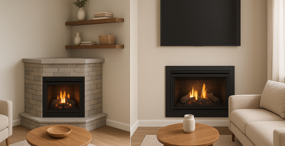 В компактном помещении каждый сантиметр важен. Камин должен греть, создавать уют и не «съедать» пространство. Главный вопрос — угловой или прямой (пристенный) формат. Оба решения популярны, но ведут себя по-разному: угловой визуально использует «мёртвый» угол, прямой — делает стену аккуратной и предсказуемой для расстановки мебели. Выбор зависит от планировки, ширины стены, наличия окна/двери рядом, а также типа камина: дровяной, биокамин или электрокамин.
